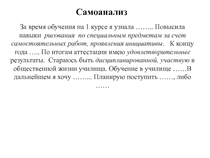 инициативы. К концу года ….. По итогам аттестации имею удовлетворительные результаты. Стараюсь быть дисциплинированной, участвую в общественной жизни училища. Обучение в училище ……В дальнейшем я хочу ……... Планирую поступить ……, либо ……