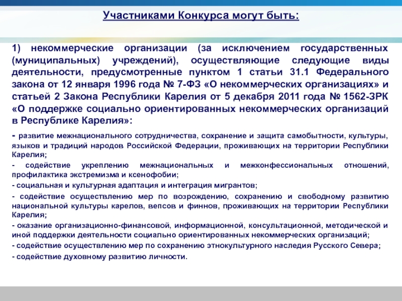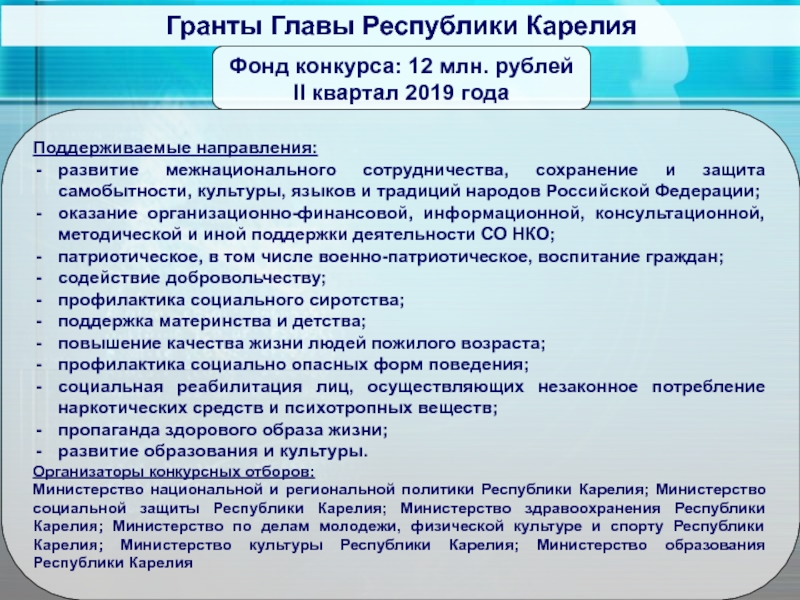 - оказание информационной, консультационной, методической и иной поддержки деятельности социально ориентированных некоммерческих организаций Республики Карелия.
