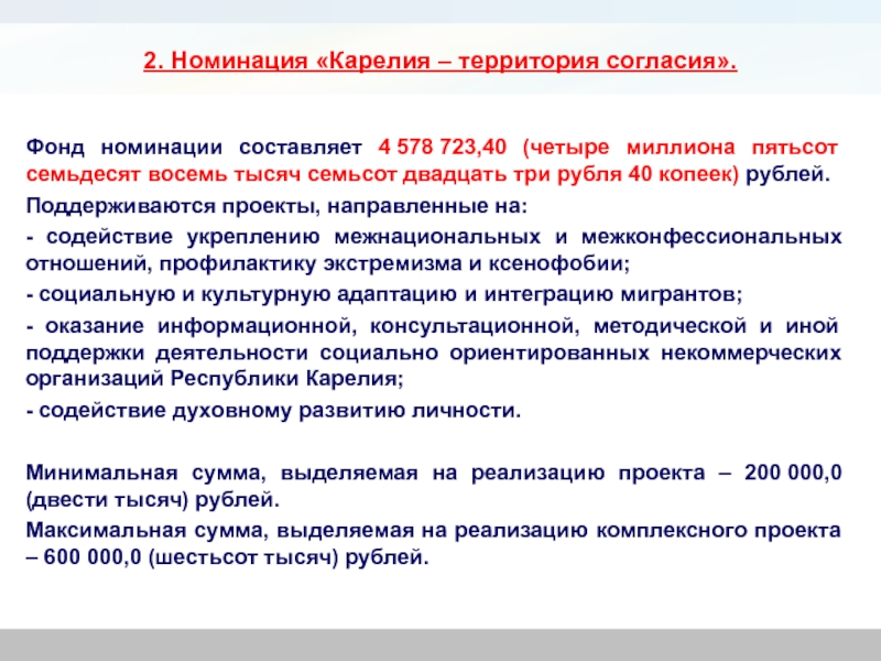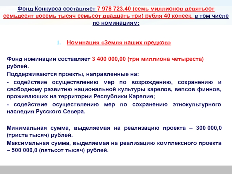 Фонд Конкурса составляет 7 978 723,40 (семь миллионов девятьсот семьдесят восемь тысяч семьсот двадцать три) рубля 40 копеек, в том числе по номинациям:
