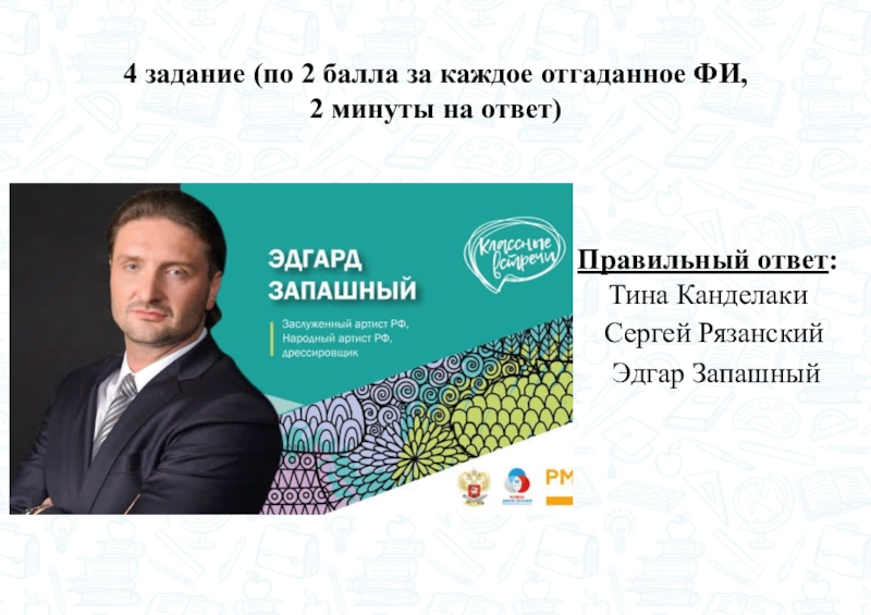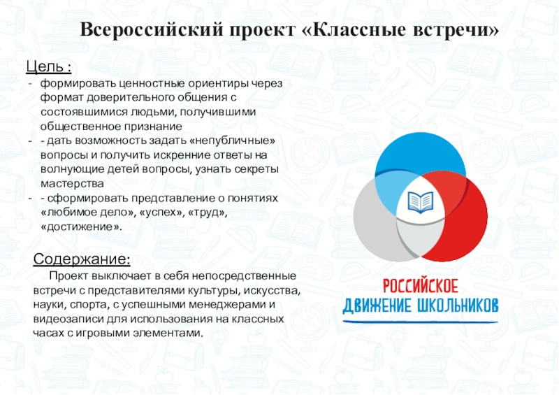 Проект выключает в себя непосредственные встречи с представителями культуры, искусства, науки, спорта, с успешными менеджерами и видеозаписи для использования на классных часах с игровыми элементами.