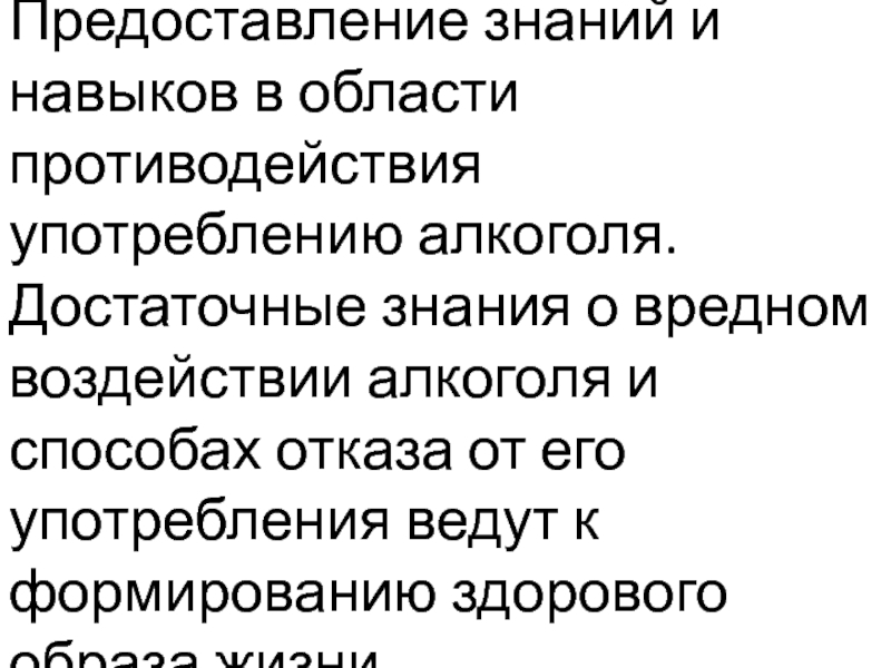 Слайд 14Предоставление знаний и навыков в области противодействия употреблению алкоголя. Достаточные