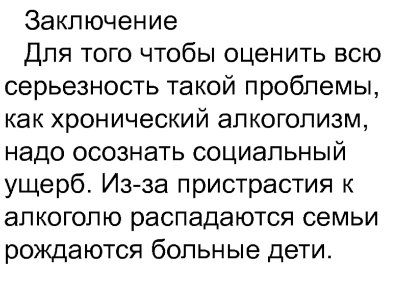 Слайд 19Из-за распространенности алкоголизма происходит уменьшение общего интеллектуального уровня общества, что