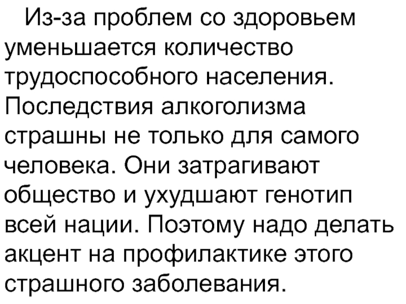 Слайд 20Из-за проблем со здоровьем уменьшается количество трудоспособного населения. Последствия алкоголизма