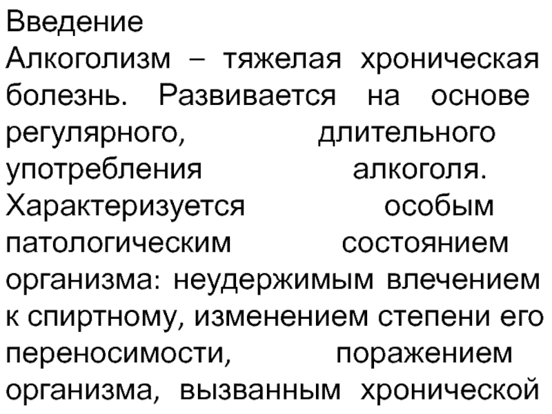 употребления алкоголя. Характеризуется особым патологическим состоянием организма: неудержимым влечением к