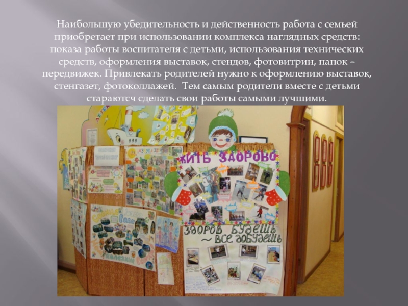 средств, оформления выставок, стендов, фотовитрин, папок – передвижек. Привлекать родителей нужно к оформлению выставок, стенгазет, фотоколлажей. Тем самым родители вместе с детьми стараютсч сделать свои работы самыми лучшими.