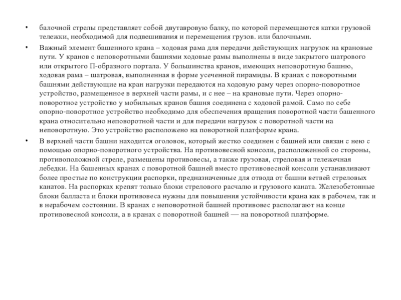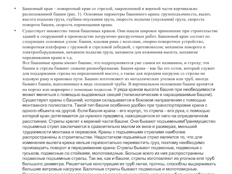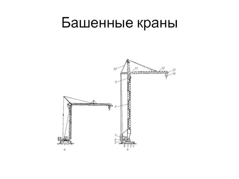 Слайд 22Башенный кран – поворотный кран со стрелой, закрепленной в верхней