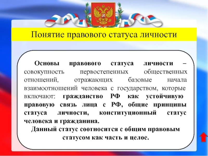 которые включают: гражданство РФ как устойчивую правовую связь лица с РФ, общие принципы статуса личности, конституционный статус человека и гражданина.