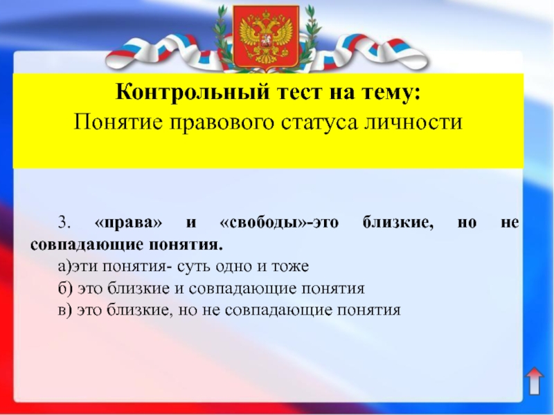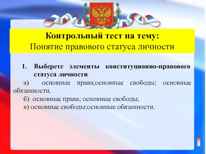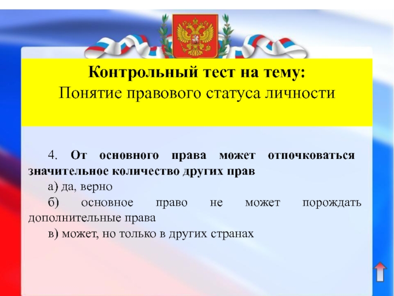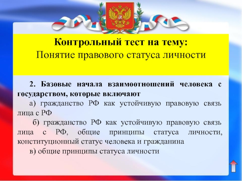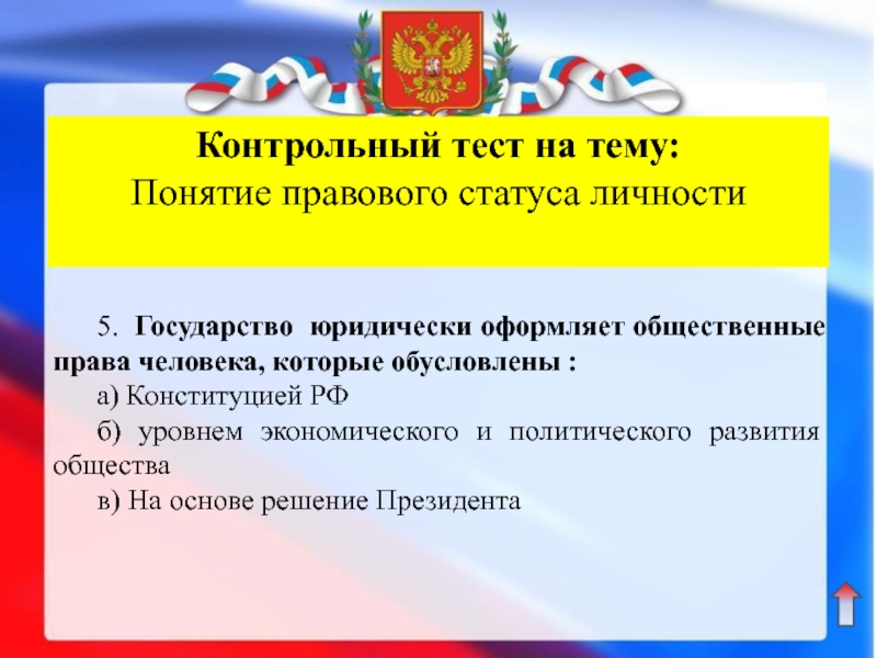 8) Контрольный тест на тему: «Понятие правового статуса личности»