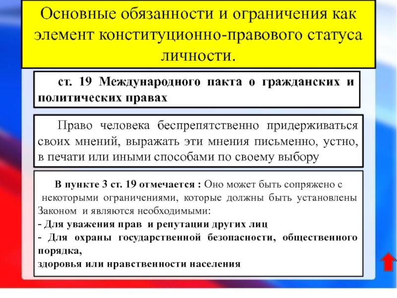 Слайд 15Основные обязанности и ограничения как элемент конституционно-правового статуса личности.