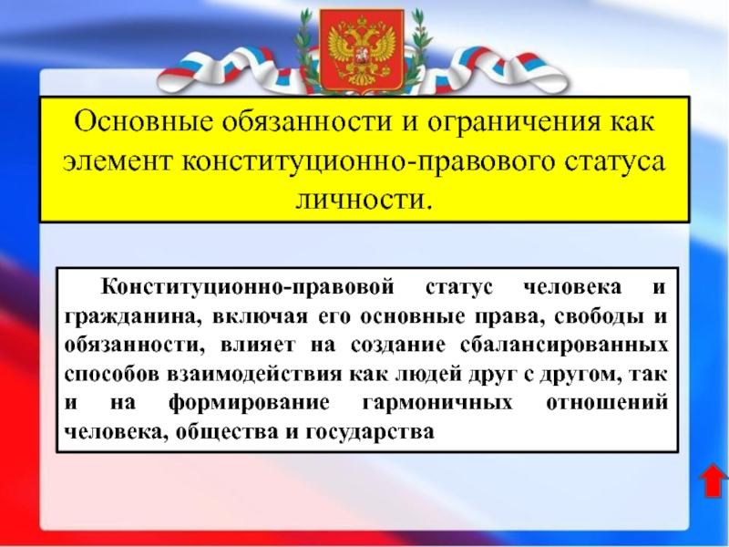 Слайд 16Основные обязанности и ограничения как элемент конституционно-правового статуса личности.