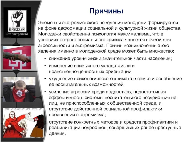 Молодежный экстремизм обычно начинается с выражения пренебрежения к действующим в обществе правилам и нормам поведения или в отрицании их.