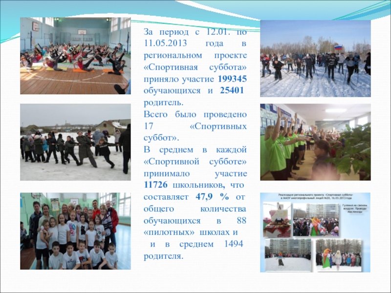 В среднем в каждой «Спортивной субботе» принимало участие 11726 школьников, что составляет 47,9 % от общего количества обучающихся в 88 «пилотных» школах и