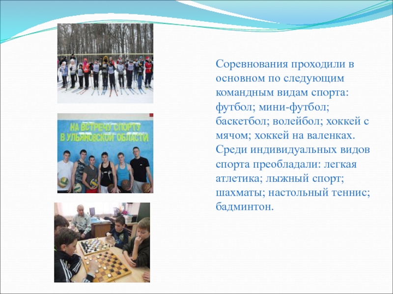 Слайд 13Соревнования проходили в основном по следующим командным видам спорта: футбол;