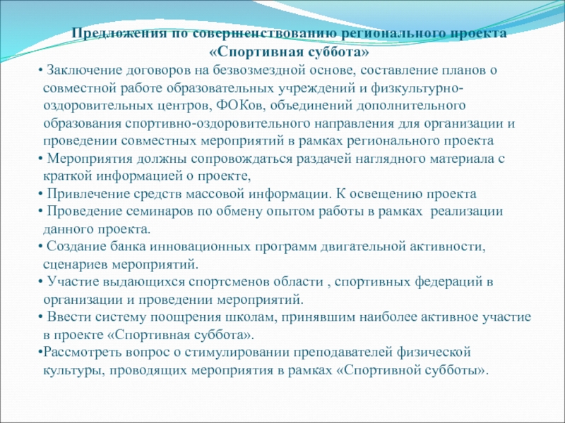 Слайд 18Предложения по совершенствованию регионального проекта «Спортивная суббота»