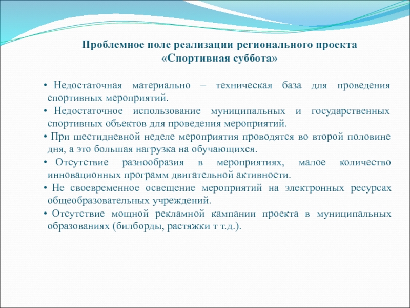 Проблемное поле реализации регионального проекта «Спортивная суббота»