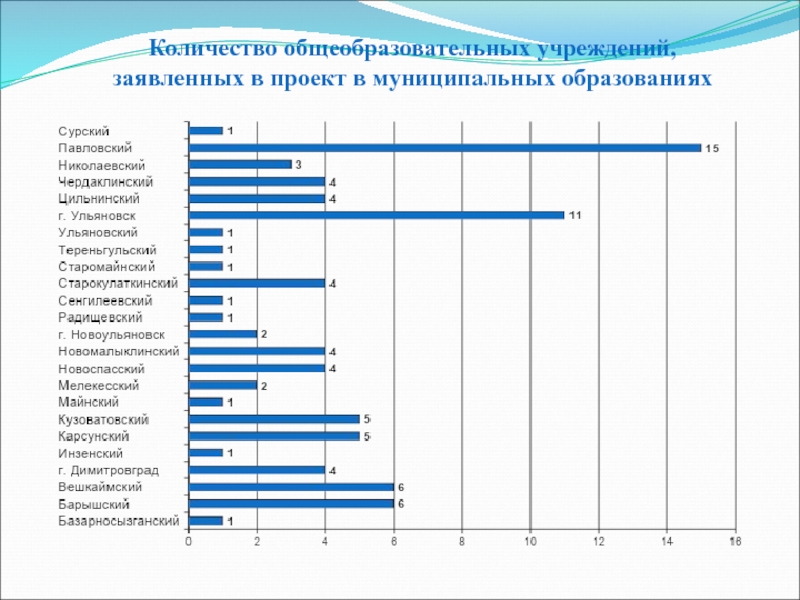 Слайд 3Количество общеобразовательных учреждений, заявленных в проект в муниципальных образованиях