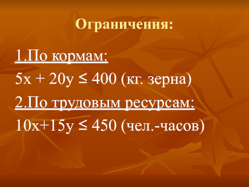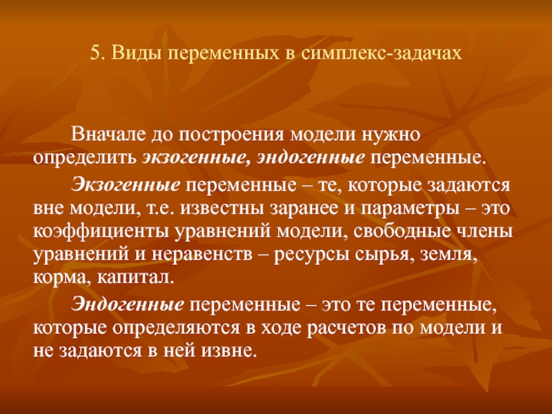 модели, т.е. известны заранее и параметры – это коэффициенты уравнений модели, свободные члены уравнений и неравенств – ресурсы сырья, земля, корма, капитал.