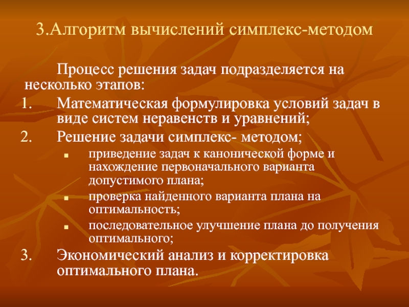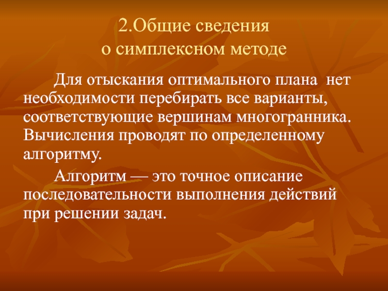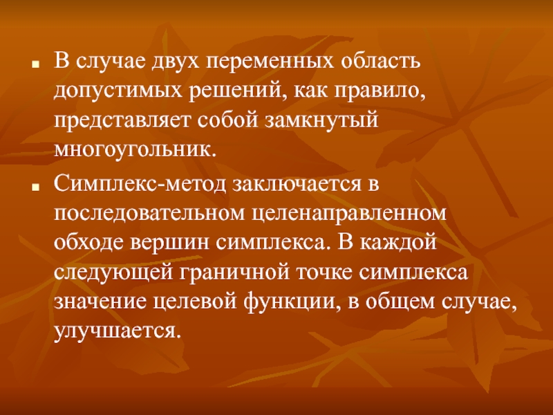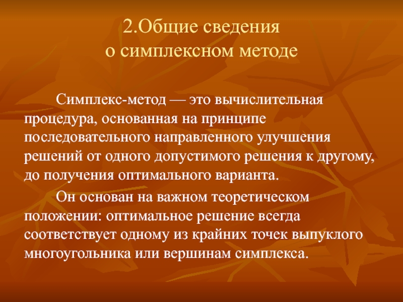 Он основан на важном теоретическом положении: оптимальное решение всегда соответствует одному из крайних точек выпуклого многоугольника или вершинам симплекса.