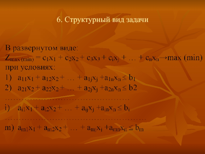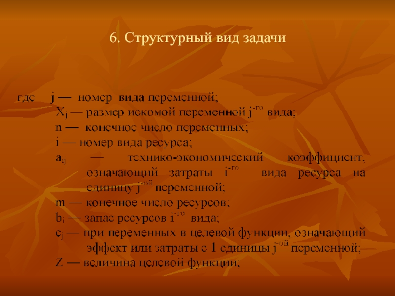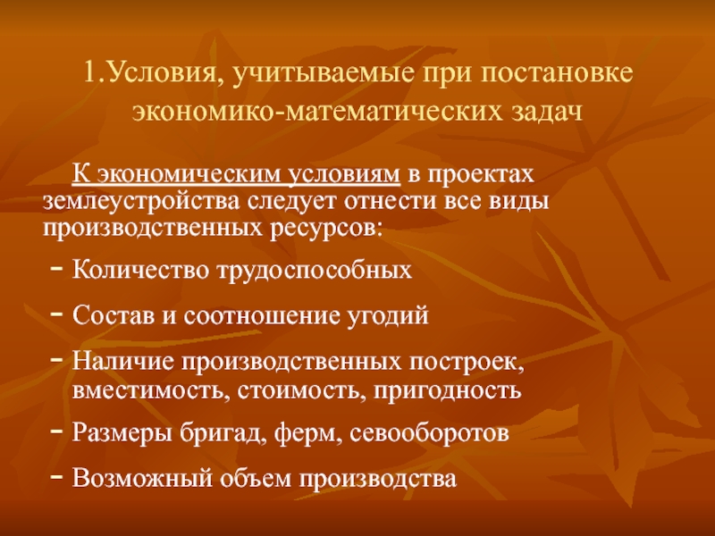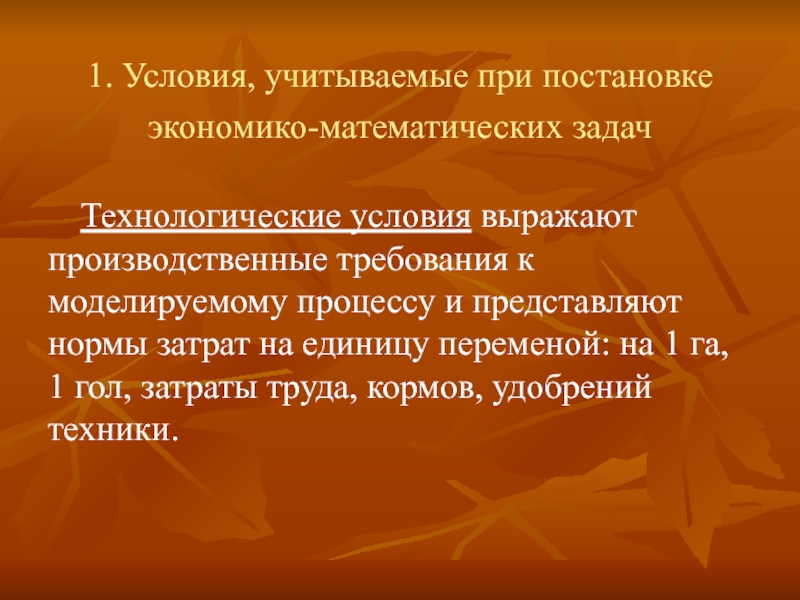 Слайд 61.Условия, учитываемые при постановке экономико-математических задач