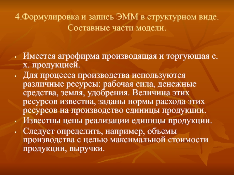 Слайд 134.Формулировка и запись ЭММ в структурном виде. Составные части модели.