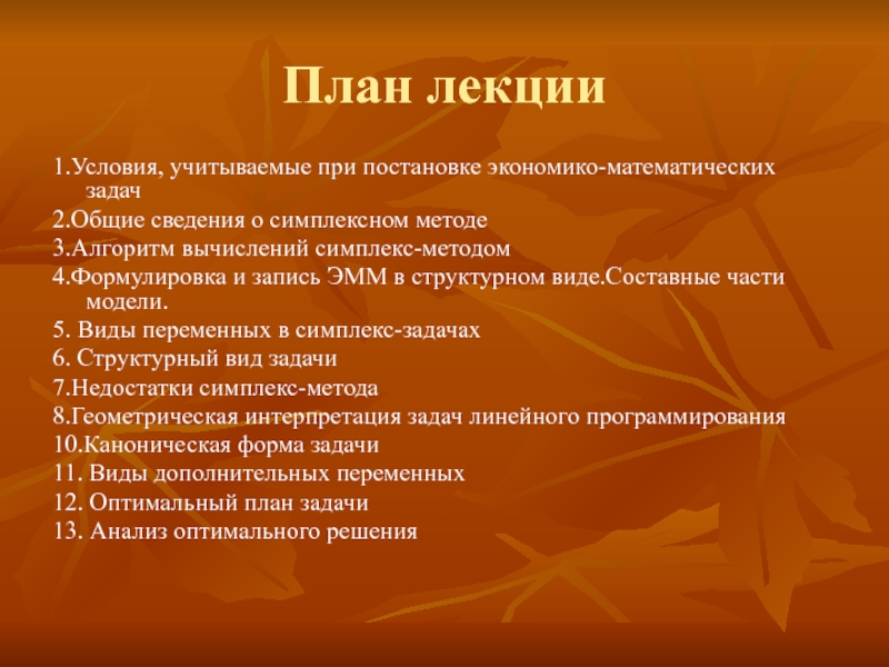 Слайд 41.Условия, учитываемые при постановке экономико-математических задач