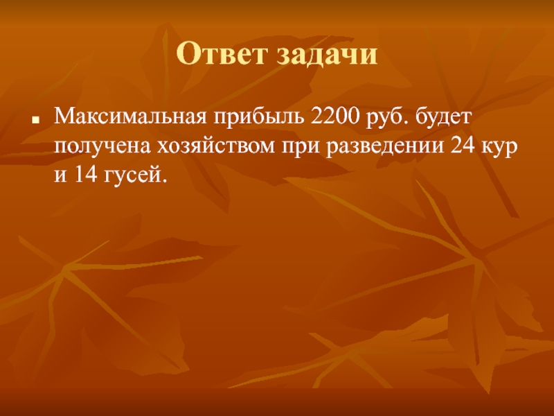 Следует определить, например, объемы производства с целью максимальной стоимости продукции, выручки.