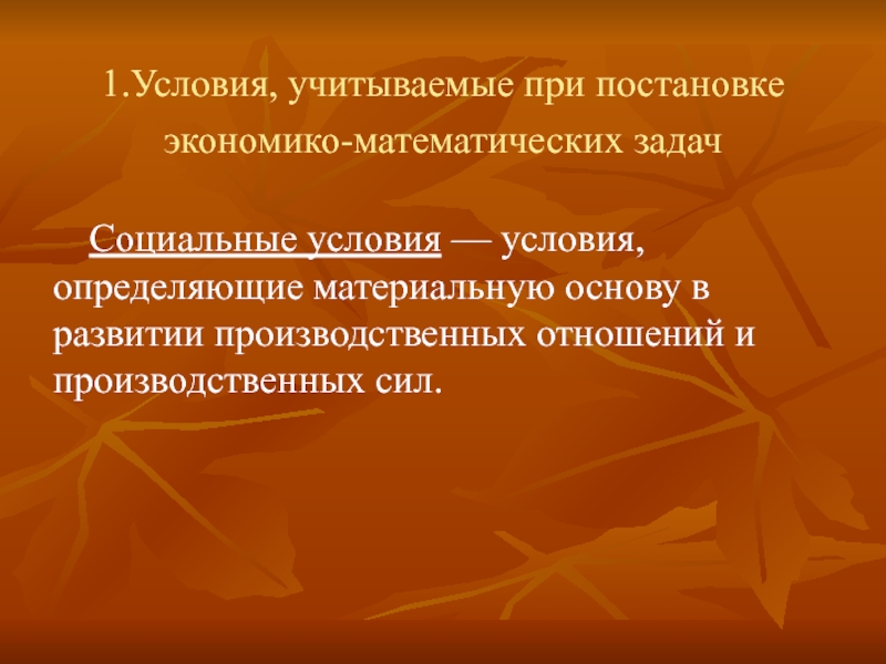 1.Условия, учитываемые при постановке экономико-математических задач