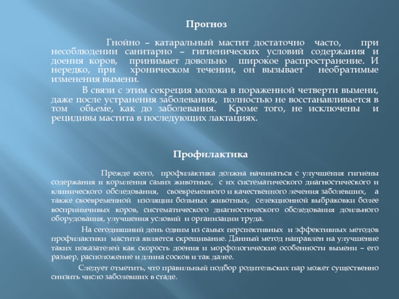 Гнойно – катаральный мастит достаточно часто, при несоблюдении санитарно – гигиенических условий содержания и доения коров, принимает довольно широкое распространение. И нередко, при хроническом течении, он вызывает необратимые изменения вымени.