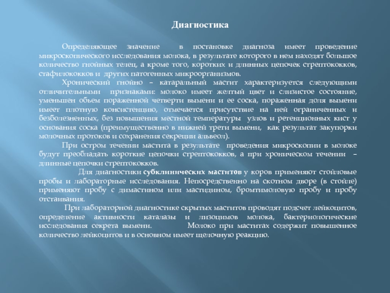 Определяющее значение в постановке диагноза имеет проведение микроскопического исследования молока, в результате которого в нем находят большое количество гнойных телец, а кроме того, коротких и длинных цепочек стрептококков, стафилококков и других патогенных микроорганизмов.