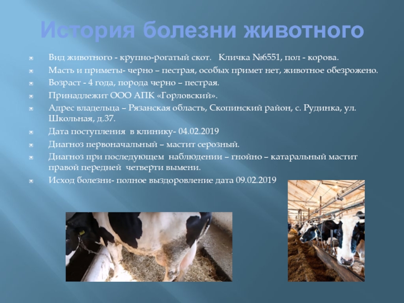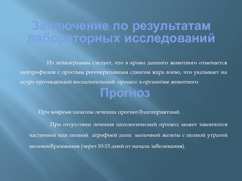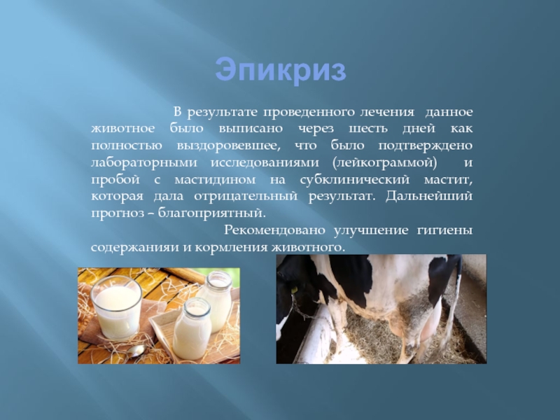 полностью выздоровевшее, что было подтверждено лабораторными исследованиями (лейкограммой) и пробой с мастидином на субклинический мастит, которая дала отрицательный результат. Дальнейший прогноз – благоприятный.