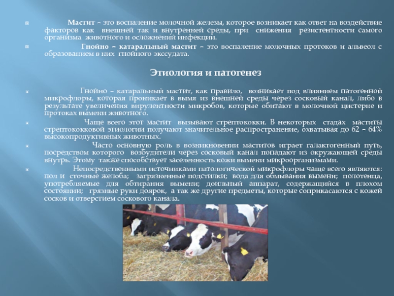 Чаще всего этот мастит вызывают стрептококки. В некоторых стадах маститы стрептококковой этиологии получают значительное распространение, охватывая до 62 – 64% высокопродуктивных животных.