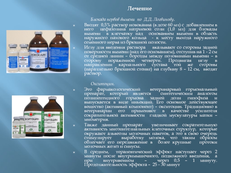 Вводят 0,5% раствор новокаина (в дозе 60 мл) с добавлением в него цефазолина натриевой соли (1,0 мл) для блокады вымени в клетчатку над основанием вымени в область наружного пахового кольца - к месту выхода наружного семенного нерва из брюшной полости.