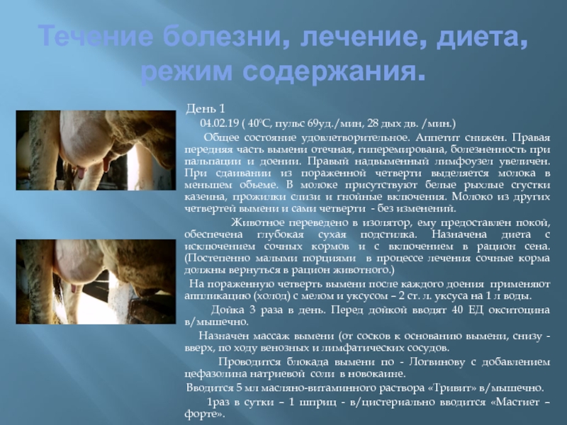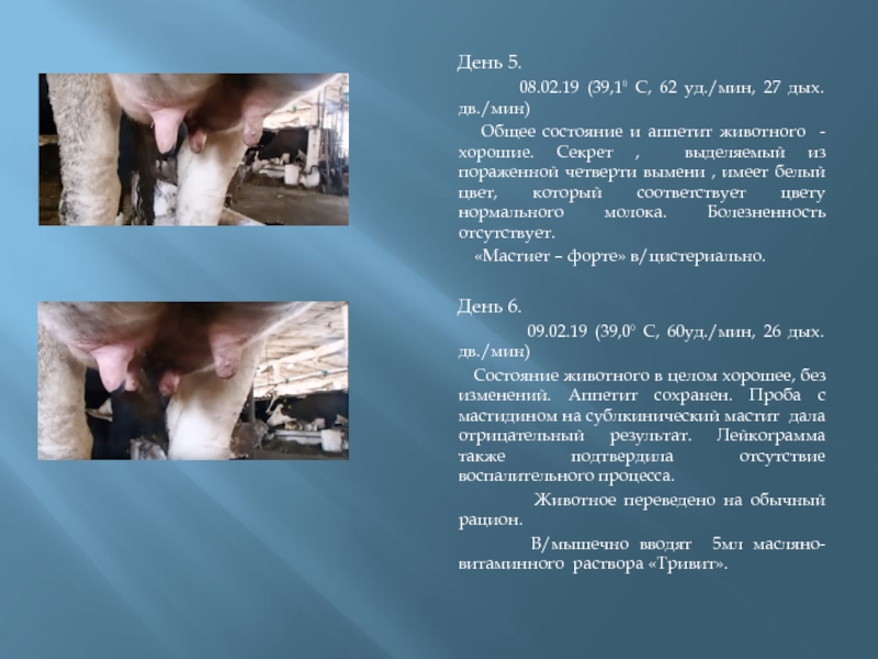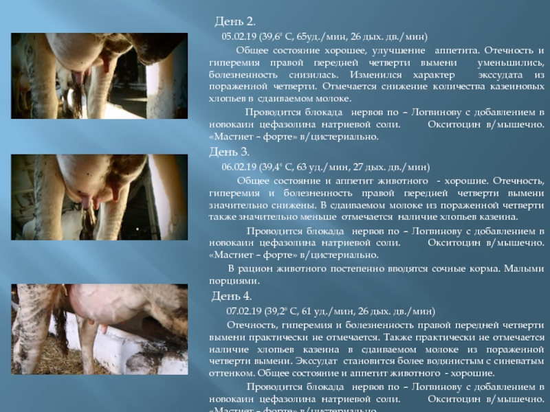 Общее состояние и аппетит животного - хорошие. Отечность, гиперемия и болезненность правой передней четверти вымени значительно снижены. В сдаиваемом молоке из пораженной четверти также значительно меньше отмечается наличие хлопьев казеина.