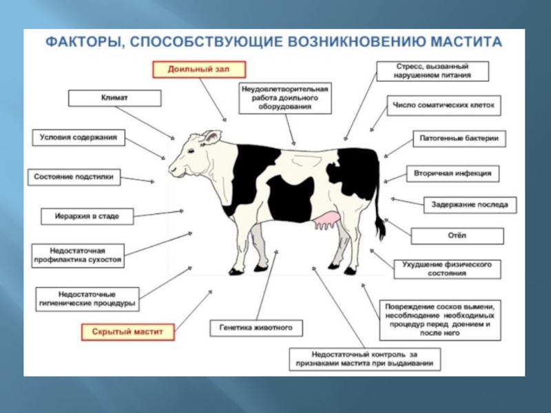 Непосредственными источниками патологической микрофлоры чаще всего являются: пол и сточные желоба; загрязненные подстилки; вода для обмывания вымени; полотенца, употребляемые для обтирания вымени; доильный аппарат, содержащийся в плохом состоянии; грязные руки доярок, а так же другие предметы, которые соприкасаются с кожей сосков и отверстием соскового канала.