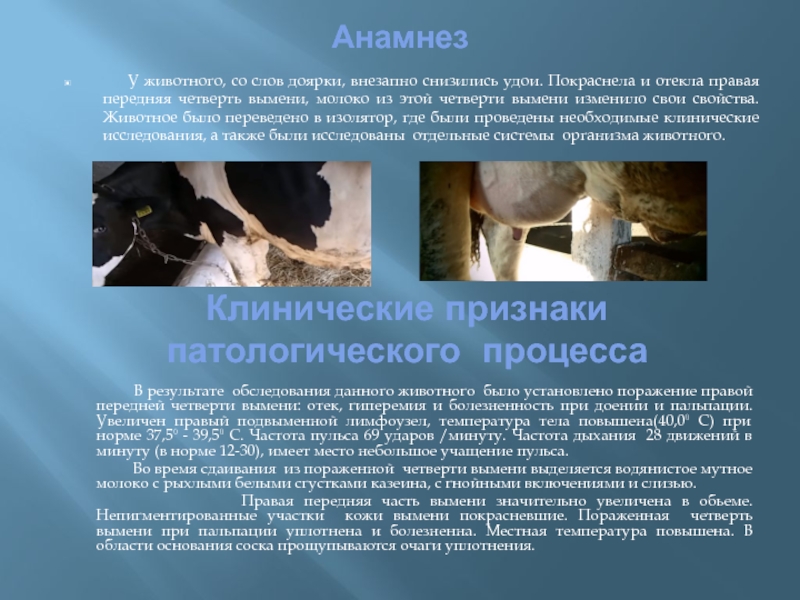 Общее состояние удовлетворительное. Аппетит снижен. Правая передняя часть вымени отечная, гиперемирована, болезненность при пальпации и доении. Правый надвыменный лимфоузел увеличен. При сдаивании из пораженной четверти выделяется молока в меньшем обьеме. В молоке присутствуют белые рыхлые сгустки казеина, прожилки слизи и гнойные включения. Молоко из других четвертей вымени и сами четверти - без изменений.