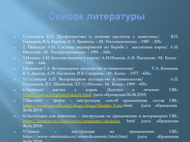 1.Гончаров В.П. Профилактика и лечение маститов у животных/