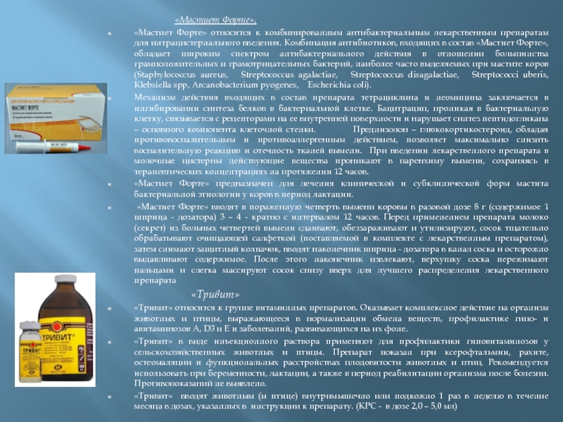 комбинированным антибактериальным лекарственным препаратам для интрацистернального введения. Комбинация антибиотиков, входящих в состав «Мастиет Форте», обладает широким спектром антибактериального действия в отношении большинства грамположительных и грамотрицательных бактерий, наиболее часто выделяемых при мастите коров (Staphylococcus aureus, Streptococcus agalactiae, Streptococcus disagalactiae, Streptococci uberis, Klebsiella spp, Arcanobacterium pyogenes, Escherichia coli).