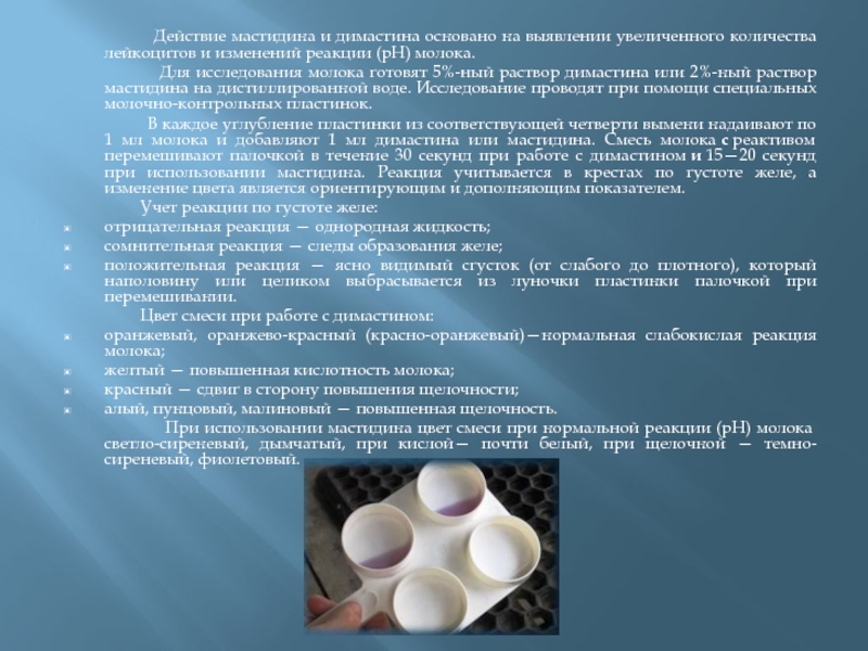При использовании мастидина цвет смеси при нормальной реакции (рН) молока светло-сиреневый, дымчатый, при кислой— почти белый, при щелочной — темно-сиреневый, фиолетовый.