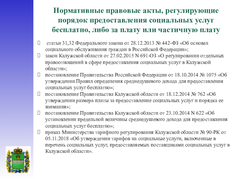 Слайд 25Нормативные правовые акты, регулирующие порядок предоставления социальных услуг бесплатно, либо