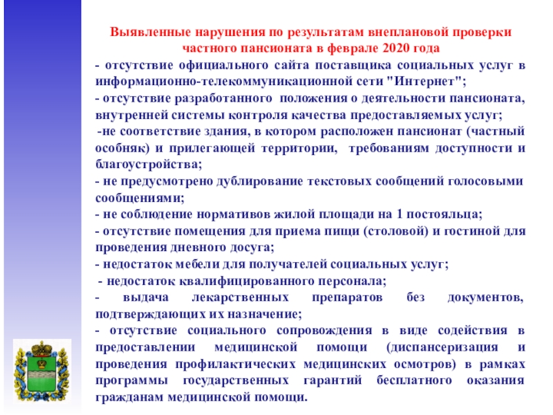 Слайд 32Выявленные нарушения по результатам внеплановой проверки частного пансионата в феврале