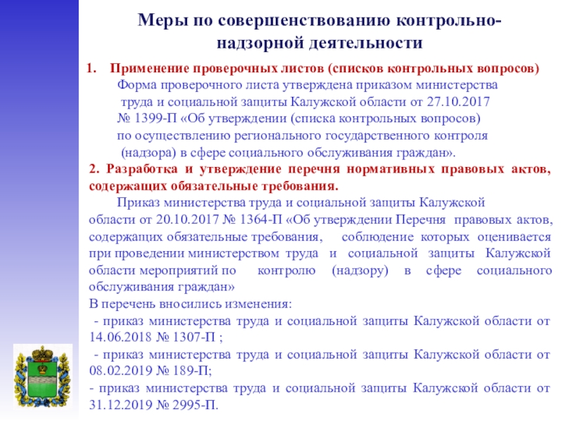 Слайд 13Меры по совершенствованию контрольно-надзорной деятельности