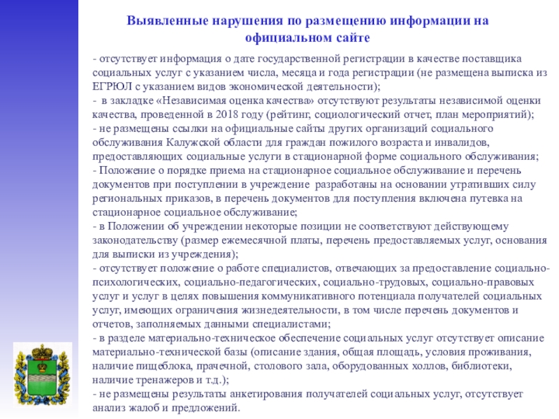 - отсутствие официального сайта поставщика социальных услуг в информационно-телекоммуникационной