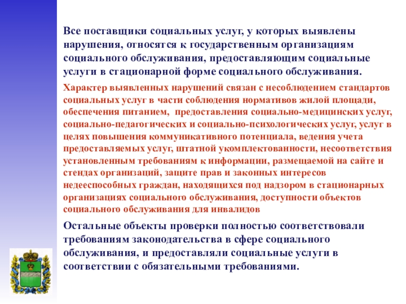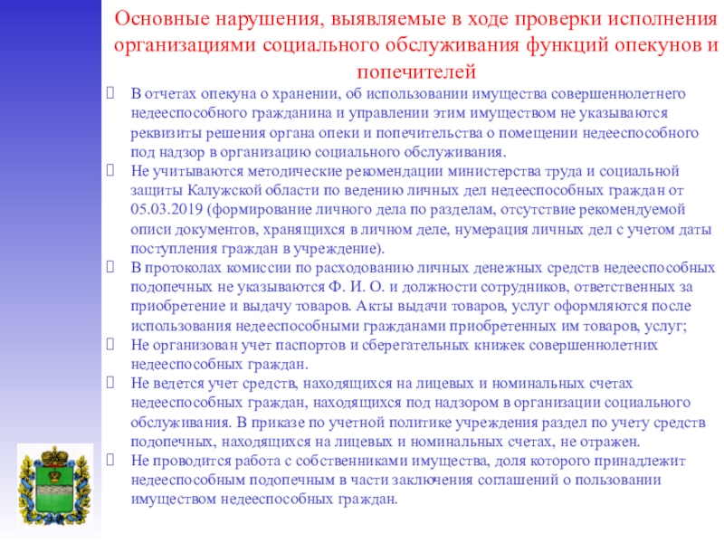 Слайд 30Основные нарушения, выявляемые в ходе проверки исполнения организациями социального обслуживания