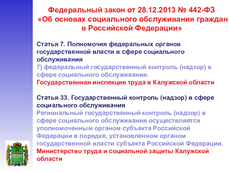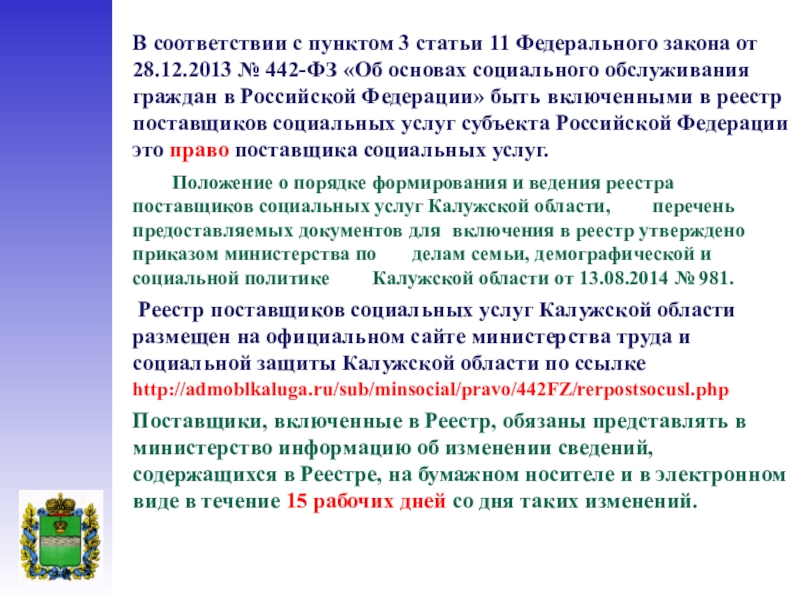 Слайд 3Федеральный закон от 28.12.2013 № 442-ФЗ