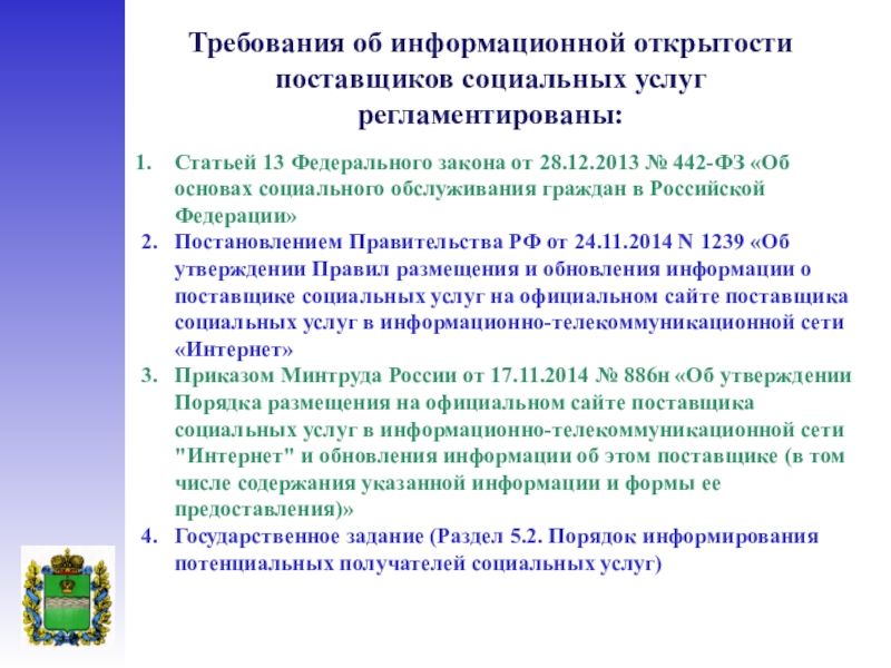 Слайд 23Требования об информационной открытости поставщиков социальных услуг регламентированы: