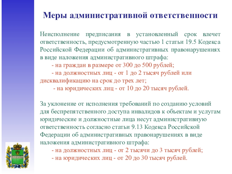 За уклонение от исполнения требований по созданию условий для беспрепятственного доступа инвалидов к объектам и услугам юридические и должностные лица несут административную ответственность согласно статьи 9.13 Кодекса Российской Федерации об административных правонарушениях в виде наложения административного штрафа: