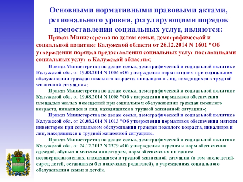 политике Калужской области от 26.12.2014 N 1601 "Об утверждении порядка предоставления социальных услуг поставщиками социальных услуг в Калужской области»;
