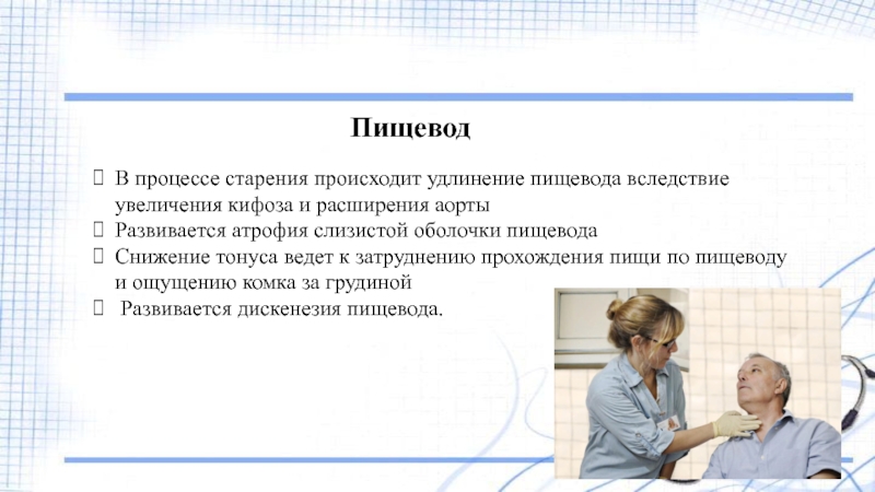 В процессе старения происходит удлинение пищевода вследствие увеличения кифоза и