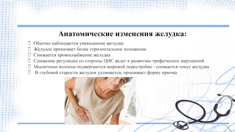 В глубокой старости желудок удлиняется, принимает форму крючка