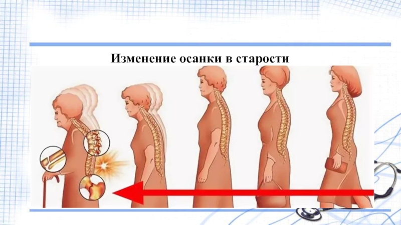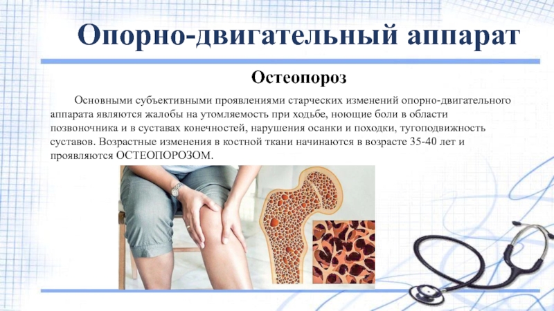области позвоночника и в суставах конечностей, нарушения осанки и походки, тугоподвижность суставов. Возрастные изменения в костной ткани начинаются в возрасте 35-40 лет и проявляются ОСТЕОПОРОЗОМ.